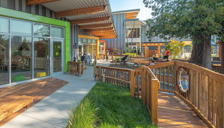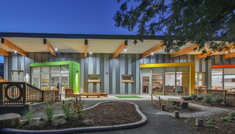Playing with two different panel depths and two different metallic panel colours, the architect created deep shadow lines. This three-inch change in depth was paired with unbroken panels, which wrap around to form integrated corners. The result is a subtle backdrop for the playful, colourful window frames, allowing them to take centre stage.