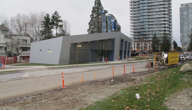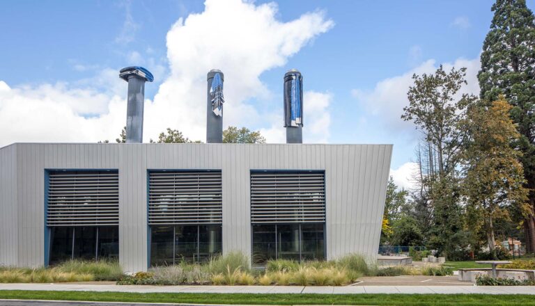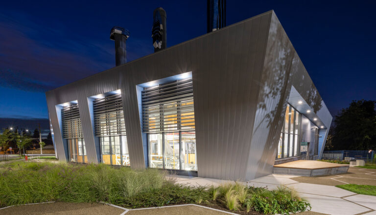 The West Village Park & District Energy Centre is both an efficient hot water heating energy plant and an attractive and inviting parkscape. The panels are deceptively simple-looking, appearing to be straight-forward panels with a half-inch reveal. In reality, they’re incredibly complex: because of the prismatic shape of the structure, there are no 90-degree corners or simple lines. Custom engineered panels “fan” at the top to meet the dimensions of the building, conforming to the structure rather than forcing the structure to contend with standardized panels.